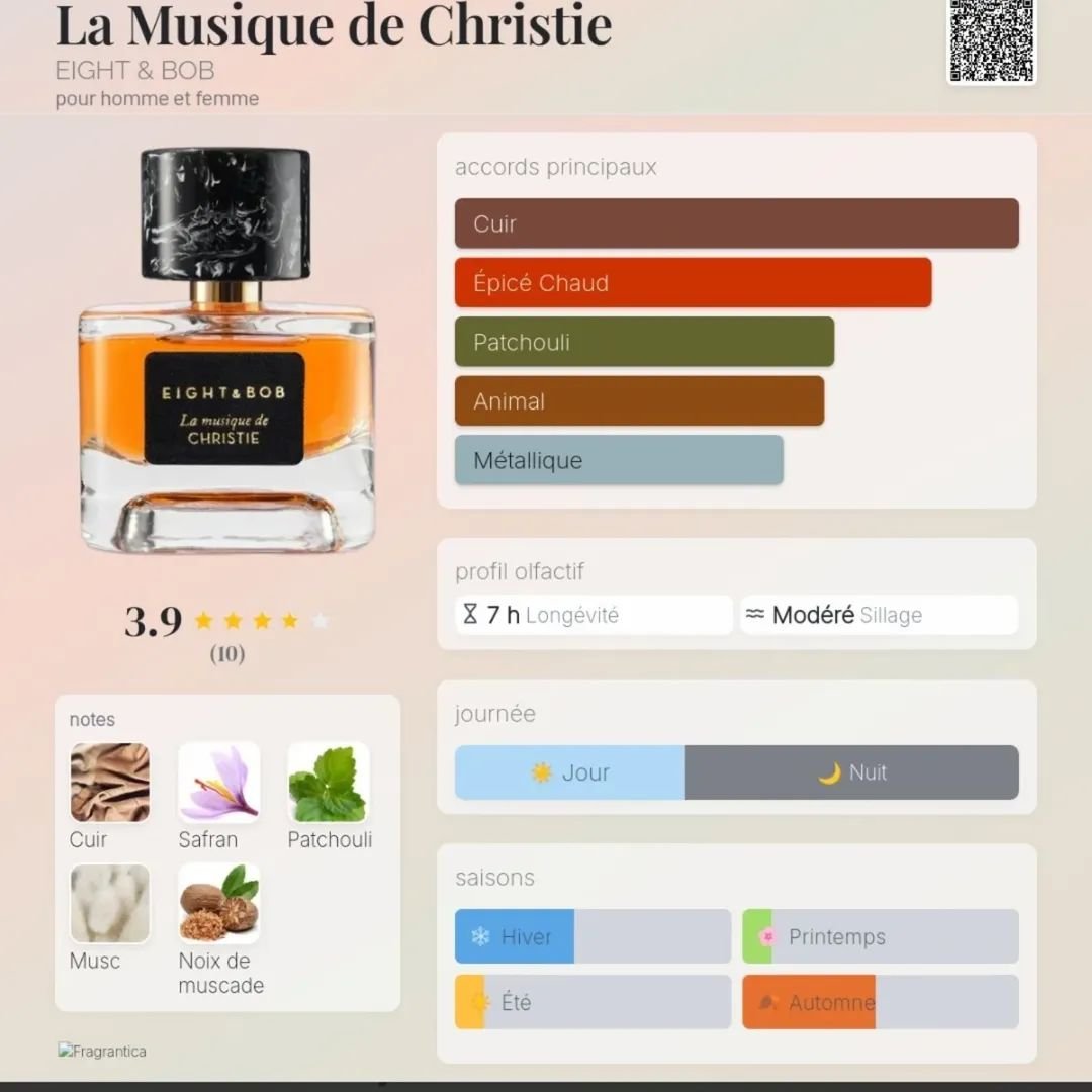 إفتتاحية العطر الزعفران و جوزه الطيب; قلب العطر الجلود و الباتشولي; قاعدة العطر من المسك.